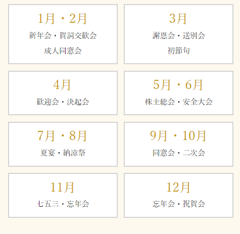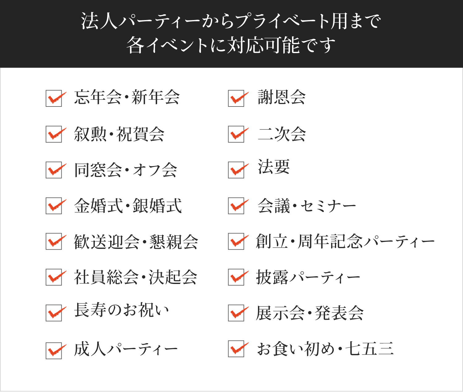 会場の種類も豊富で、少人数のパーティーから企業イベント、会議など幅広くお使い頂けます。