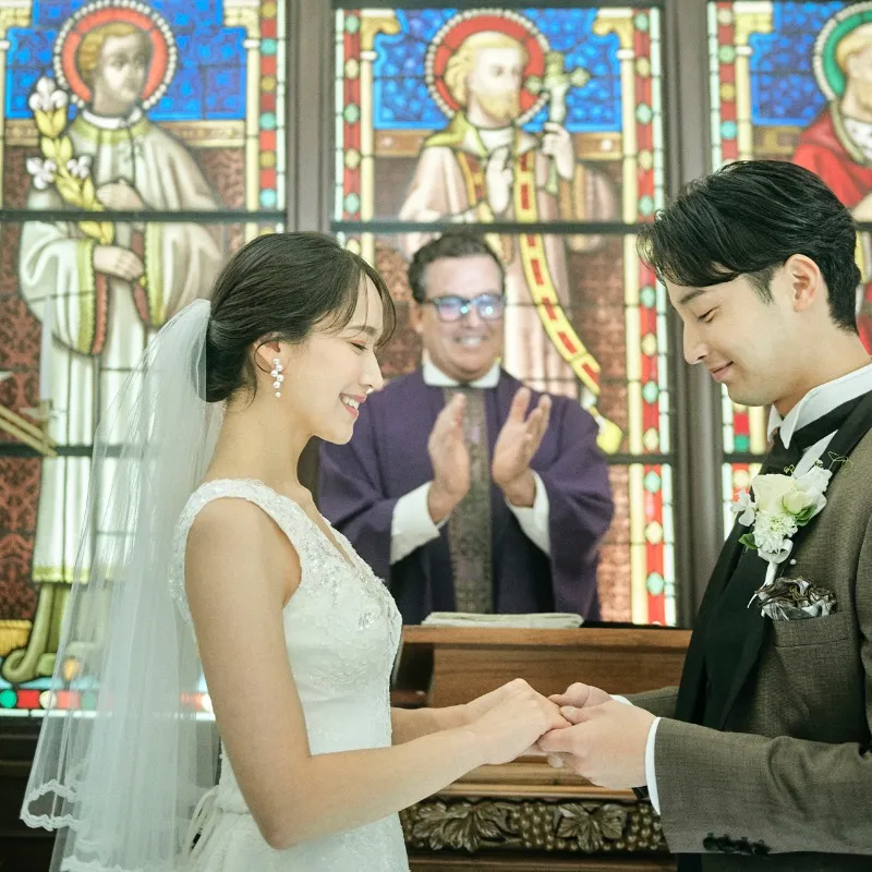 | 模擬挙式 | 【森の教会での誓い】緑に囲まれたナチュラルな雰囲気に木造りのベンチが調和した心地よいチャペル。ステンドグラスの光が輝く祭壇はゲストとの距離が近く、あたたかなまなざしを感じるアットホームな誓いの時間に… |